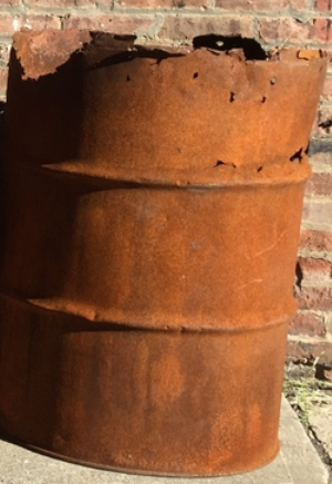 When you live in the country, you can burn whenever you like as long as the fire is contained in a trash barrel or something similar. We went through several steel barrels. They'd start out looking nice and painted. But as we'd burn trash, the paint would flake off, and after just a short time, they'd look much like the image at left, only shorter as the bottom rusted out.